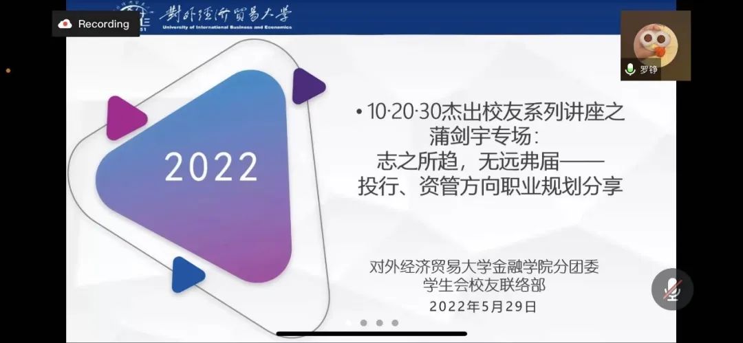 2022年5月29号上午9点,由金融学院投资系组织筹划,金融学院分团委学生会校友联络部承办的金融学院10·20·30杰出校友系列讲座之蒲剑宇专场“志之所趋,无远弗届——投行资管方向职业规划分享”顺利举办。